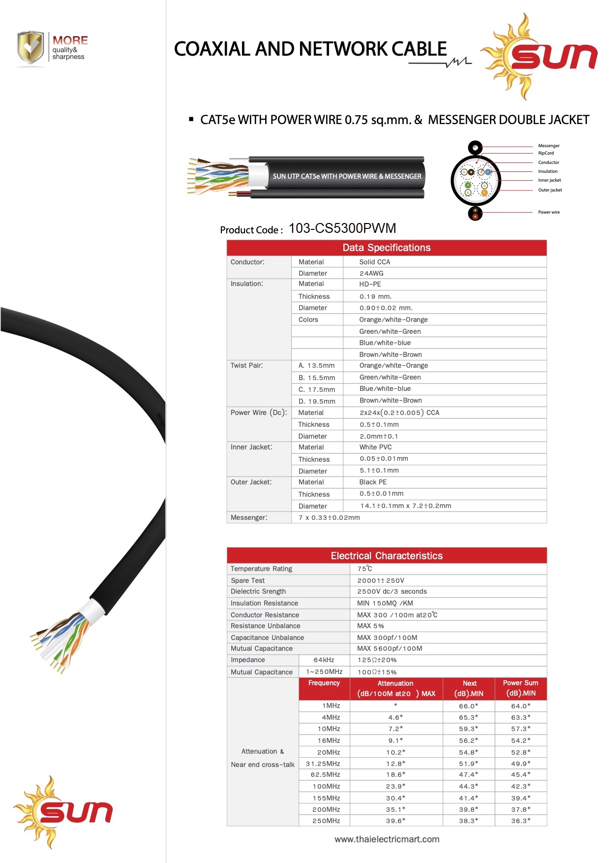สาย LAN CAT5E OUTDOOR+ POWER WIRE ขนาด 0.75 sq.mm. (DC)รุ่นมีลวดสลิง สีดำ ยาว 300 เมตร Double Jacket SUN